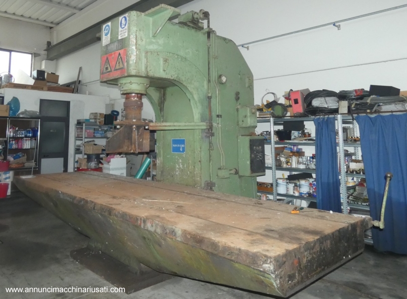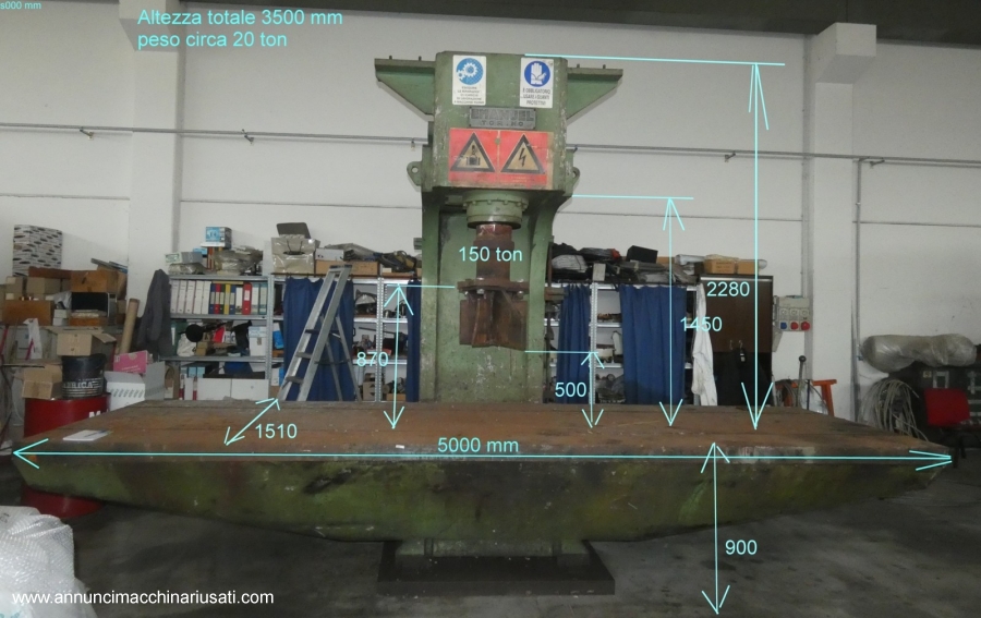 Le presse raddrizzatrici sono utilizzate per intervenire su prodotti di acciaieria grezzi o per rifinire gruppi già saldati portandoli alla forma desiderata. Le macchine realizzate si distinguono per elevata rigidezza della struttura, massima flessibilità di comando e di precisione. Le presse idrauliche per raddrizzare sono strumenti fondamentali in vari settori industriali. Queste macchine utilizzano la forza generata dalla pressione di un fluido per comprimere, piegare, stampare o deformare materiali. Le presse idrauliche sono disponibili in diverse capacità e tipi, adatte per operazioni di formatura, piegatura, forgiatura, imbutitura, estrusione a freddo, raddrizzamento, bordatura, punzonatura e metallurgia delle polveri Specifiche pressa Emanuel 150 ton Modello Idra 150 Incavo 820 mm Dimensione tavola 5000 x1550 Potenza 150 ton. Velocita del pistone Variabile continua Corsa pistone 400 mm Luce massima tra pistone e tavola 870 mm Luce mminima tra pistone e tavola 100 mm circa Peso della macchina 200 q.li Anno di costruzione Non definito Dimensioni 5000x3000x3500h Stato Macchina funzionante