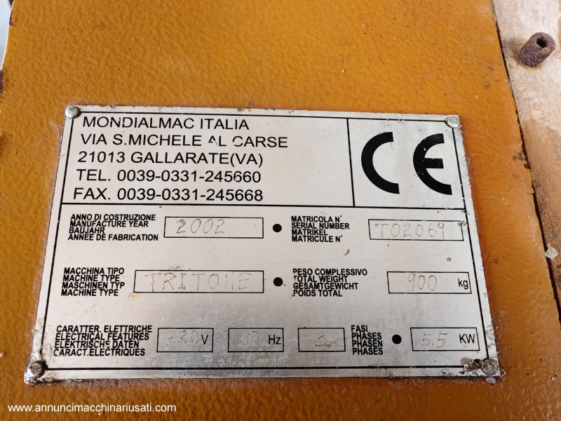 Vendesi Frantoio per la triturazione della pietra - Modello Tritone. Caratteristiche: Potenza : 5,5 kW Tensione: 380 volt Peso complessivo: 900kg Frequenza 50 hz In omaggio, scala in ferro per raggiungere estremità superiore (masse battenti) Ben tenuto e perfettamente funzionante. Ritiro in loco, no spedizione. Prezzo non trattabile. Maggiori informazioni direttamente per via telefonica.