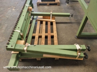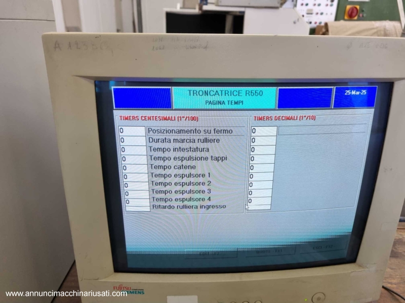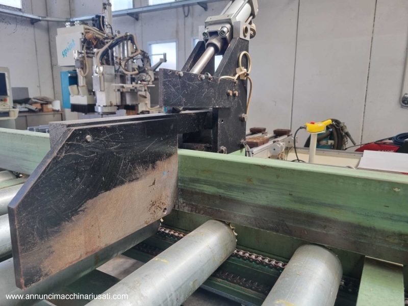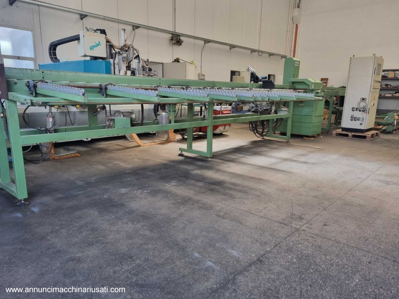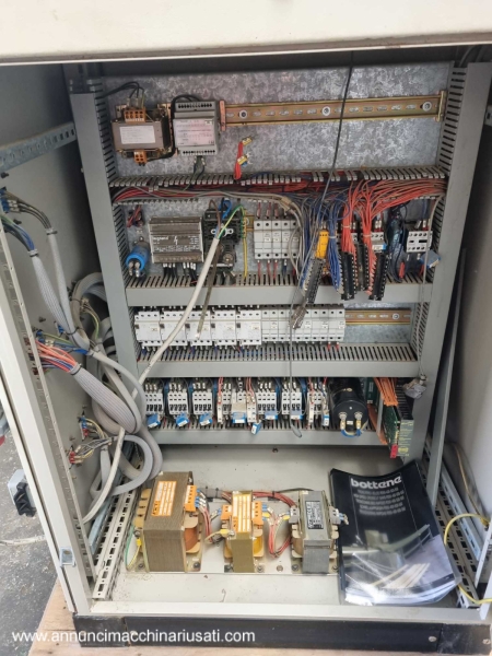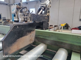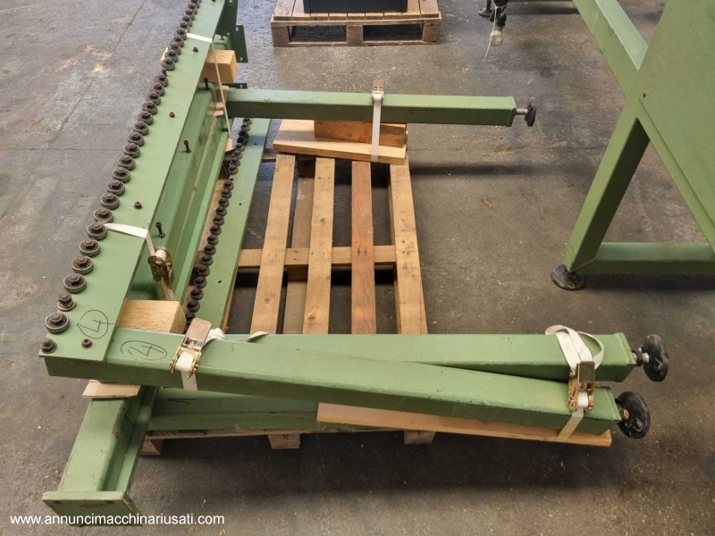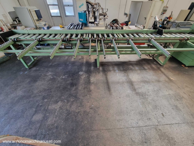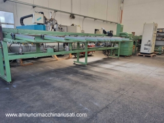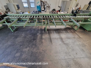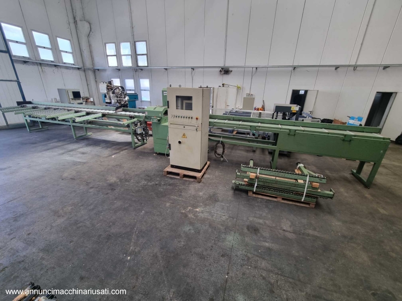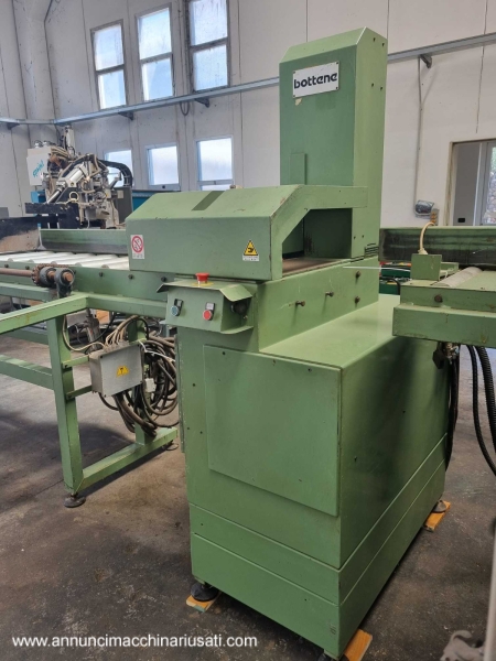Linea di troncatura - BOTTENE R550 L6000 PLC MANCANTE - MACCHINA NON FUNZIONANTE DA RETROFITTARE anno di costruzione 1998 macchina a norme CE rulliera motorizzata di entrata da 5000x500 mm completa di n. 4 supporti pezzi trasversali a rotelle folli troncatrice R550 - diametro lama max 550 mm - motore da 4 kw (5,5 hp) - sezioni di taglio max 300x150h 380x120h 420x100h - taglio con comando bimanuale rulliera motorizzata di scarico da 6500x500 mm con scarico laterale a catene motorizzate battuta di riferimento motorizzata FEL100 - corsa 6000 mm - velocità spostamento 70 m/min - precisione 1 mm quadro comandi su PC con programma di ottimizzazione manuale d'uso + certificato CE + schema elettrico ingombro per trasporto 7500x2400x2200h mm peso 4000 kg